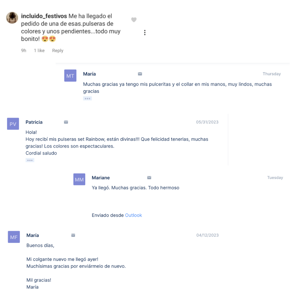 A continuación o en nuestras redes sociales Facebook, Instagram (pestaña "Our Clients"), Pinterest, Trustpilot (4.7/5) y Etsy (4.9/5) puede encontrar las opiniones de nuestros clientes.