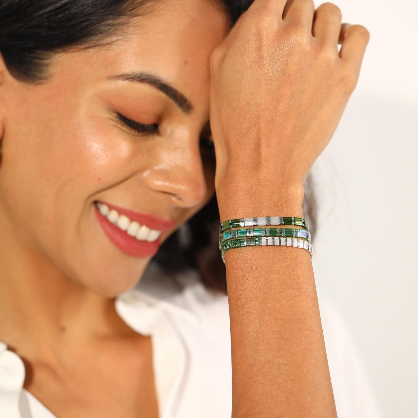 Los ricos matices de verde esmeralda, verde bosque y gris claro aportan un toque sofisticado y vibrante que realza todos tus conjuntos, desde el día a día hasta las ocasiones especiales. Las piedras planas Tila y las sutiles variaciones de tonos crean un efecto natural y precioso, otorgando a cada pulsera un carácter único.