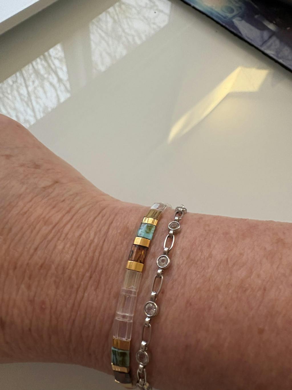The Eliana bracelet is adorned with delicate Japanese Miyuki beads in crystalline shades of amber gold and turquoise, creating a floating effect on the wrist. Lightweight yet striking, it offers natural elegance, whether worn alone or layered.