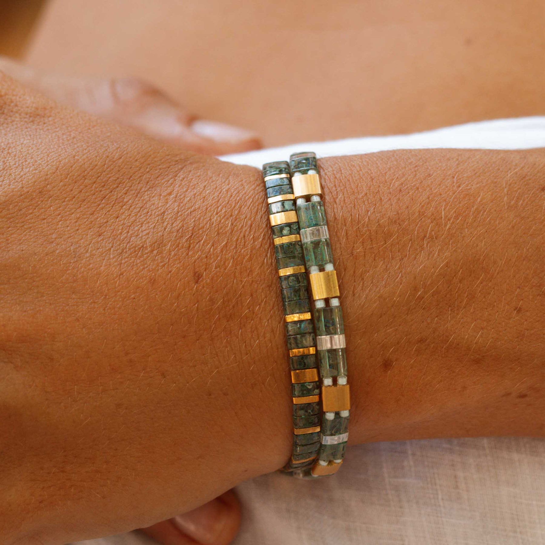 L'ensemble Elna comprend deux bracelets faits à la main : Elna avec des perles japonaises Miyuki aux tons vert d'eau et doré, et Beatrice avec des perles japonaises Miyuki aux nuances de turquoise, argent et or. Disponibles dans des tons apaisants et lumineux, ils offrent un design délicat et polyvalent, facile à assortir.
