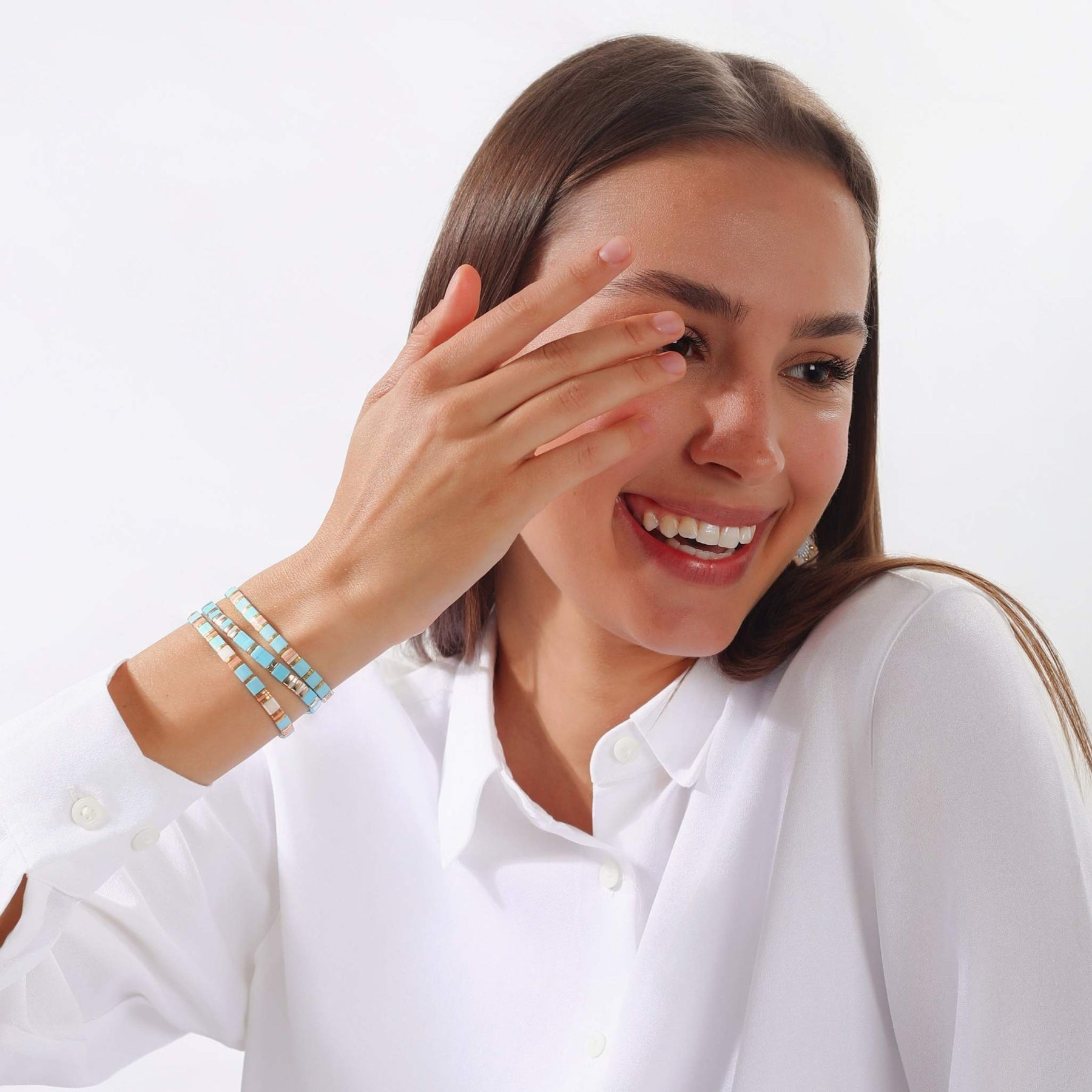 L’ensemble Thalia réunit trois bracelets faits main - Thalia, Aila et Lysa - composés de perles japonaises Miyuki dans des tons bleu clair, or et rose tendre. Leur motif graphique capte la lumière avec élégance, offrant un éclat subtil et raffiné.