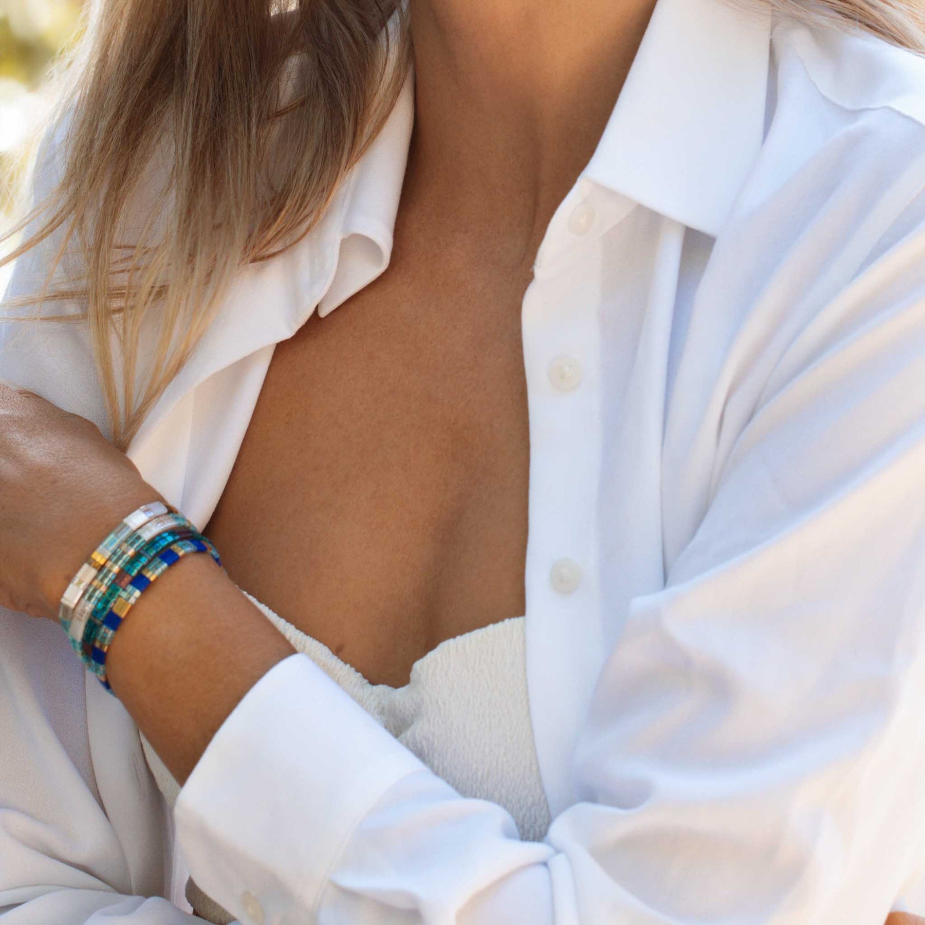 Cette nouvelle parure Calodyne de Koss Design contient nos quatre bracelets : Calodyne, Zora, Lumi, et Aeris, réalisés à partir de perles authentiques du Japon. Ils arborent des nuances harmonieuses de bleus, turquoises, blancs et dorés, offrant un éclat subtil et une élégance intemporelle.