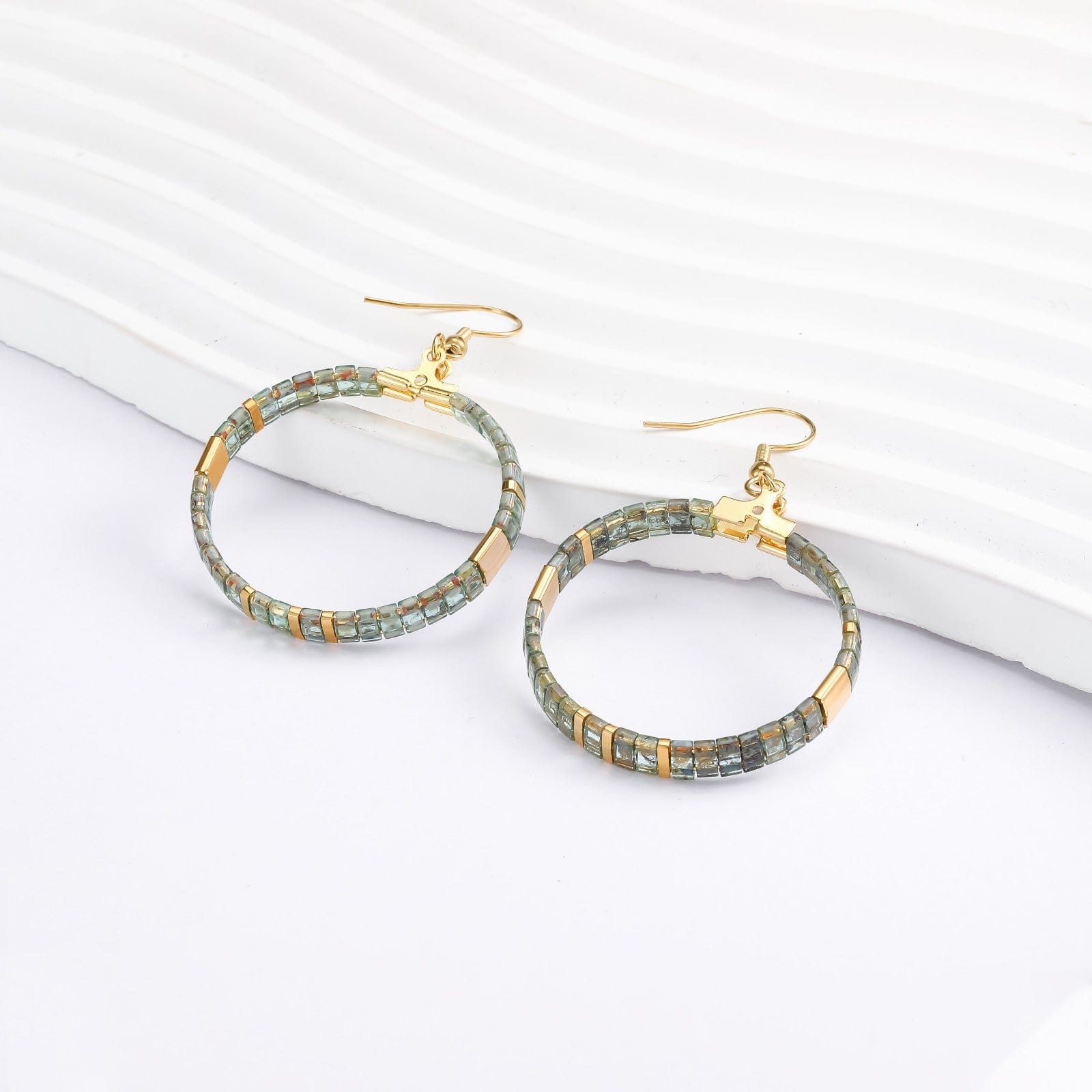 Ces créoles raffinées Luna sont ornées de perles de verre japonaises Miyuki, dans un harmonieux mélange de vert sauge et d’or subtil.