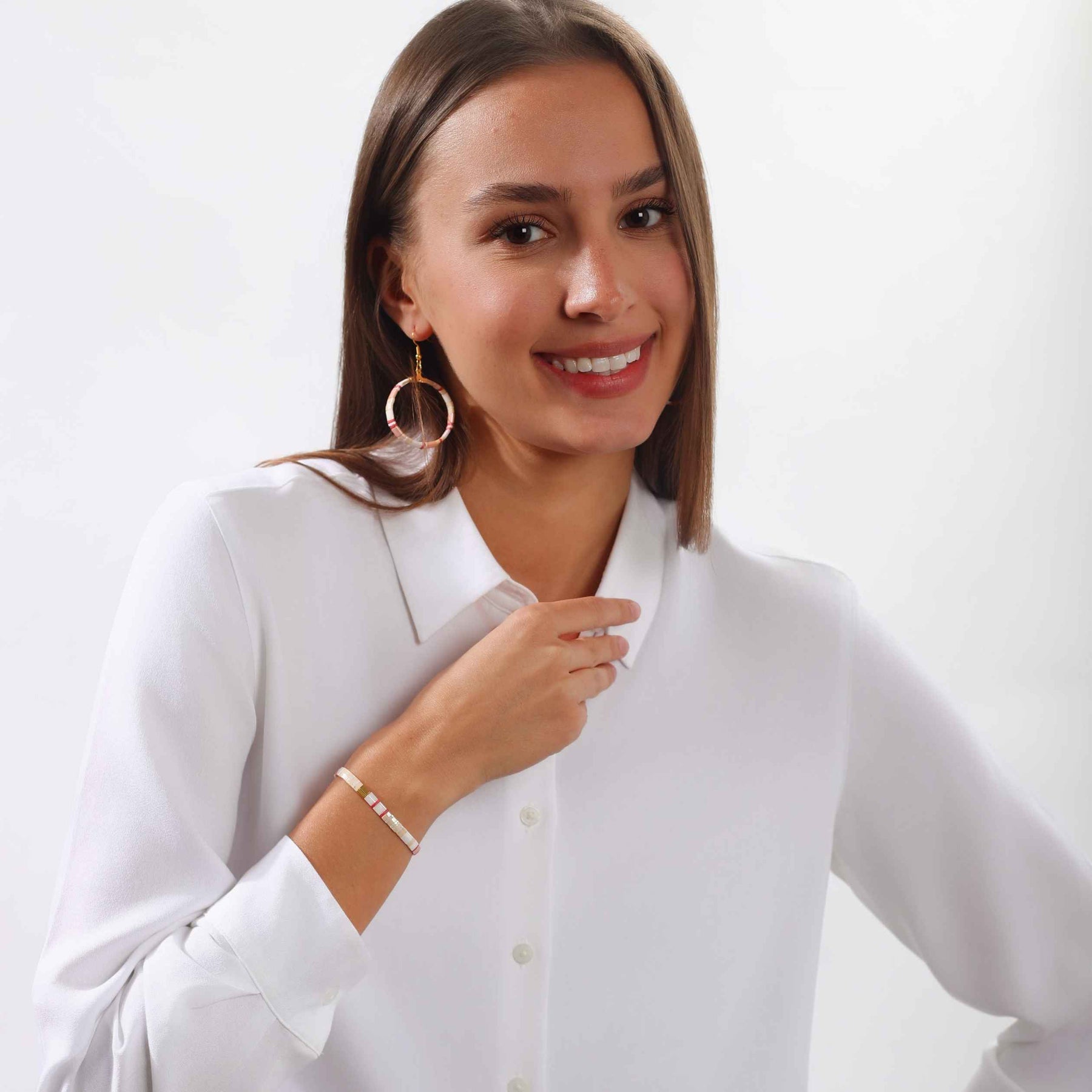 Ligera y elástica, esta pulsera está adornada con cuentas Tila rectangulares perfectamente alineadas, creando una silueta refinada, ideal para una elegancia cotidiana.